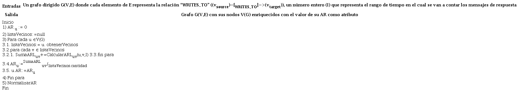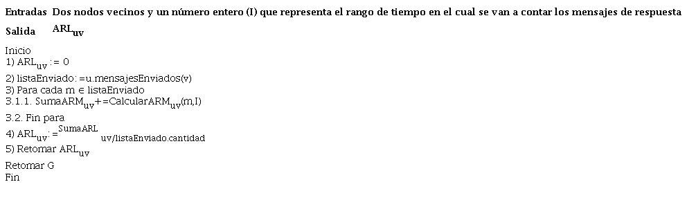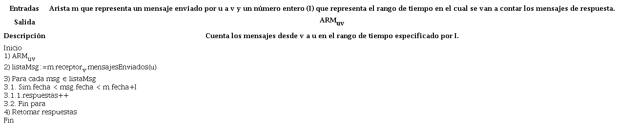 En dos usuarios u y v, la AR de un mensaje enviado por u a v (ARMuv), en un instante de tiempo t0, se calcula al contabilizar el número de respuestas del mensaje de u en un intervalo de tiempo que comprende desde t0 hasta t=t0+I. A continuación, se muestra su fórmula (10) y el pseudocódigo del algoritmo desarrollado (ver tabla 2).