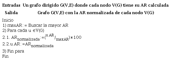 El último paso para calcular la AR es normalizar sus valores al utilizar la técnica Normalización por el mayor elemento y luego multiplicarlos por 100 para que se encuentren en el intervalo [0,100] y puedan ser utilizados para calcular la Autoridad Total (AT). A continuación, se muestra su fórmula (13) y el pseudocódigo del algoritmo desarrollado (ver tabla 5).