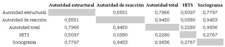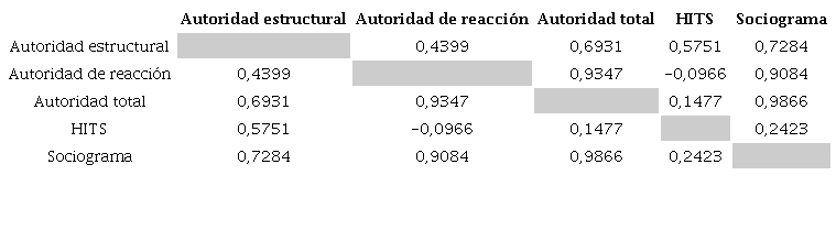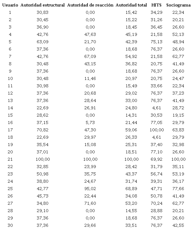 Finalmente, se determinó la correlación existente entre estos valores mediante los coeficientes de correlación de Pearson y Spearman, y se identificaron relaciones precisas entre ellos. De esta manera se puede evaluar el cumplimiento de la hipótesis de investigación, al poder comparar los resultados obtenidos en cada caso, entre el algoritmo desarrollado, el algoritmo HITS y un sociograma, al ser estos dos últimos técnicas asentadas. Se desea demostrar que el algoritmo desarrollado es válido para medir y analizar adecuadamente la autoridad e influencia que ejercen los usuarios en las redes sociales y profesionales.