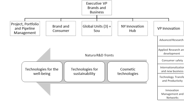 In terms of organizational structure, it was identified that the Natura company does not have only one single area responsible for innovation, but rather, it has several areas involved in the innovation process. In a way, the innovation is led by the Business Units (Vice-Presidency of Innovation), operating with advanced research, product development, consumer safety, innovation management and networks, technology transfer (science and technology) and productivity and open innovation, as Figure 2 illustrates.