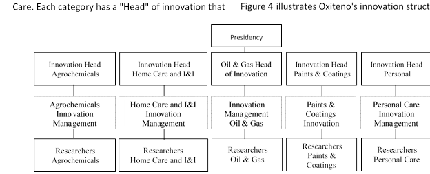 In terms of structure, Oxiteno has an innovation team within the R&D area. The company is divided into five main categories: Agrochemicals, Home Care and I&I, Oil & Gas, Paints & Coatings, and Personal reports to the President of the company. Within each category, there is a position assigned to the innovation presidency, which at the time of this research was not being filled, despite being found in the organization chart of the company. In these areas, there are researchers who work directly with the innovation for short, medium and long term.