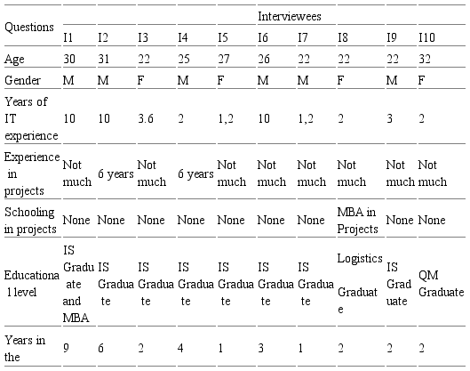 Table 1 shows the classification of respondents and Table 2 their functions. Each respondent is represented by the initial "I" plus a numeric character, e.g. “I1”. The results indicate an average age of 26, 80% with bachelor's degree, and 20% with bachelor's degree in progress. Added to this scenario, 20% have completed or are completing an MBA. Most respondents, 90%, do not have schooling in projects, only one of them is attending an MBA in projects. The average IT experience of the respondents is 4 years and 3 years is the average time working in the company where the research was carried out.