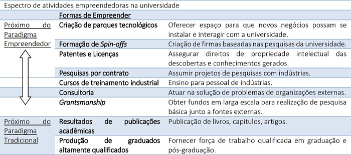 Segundo os autores, a distância entre os paradigmas considera a sofisticação das atividades empreendedoras, sendo os níveis próximos do paradigma empreendedor os que incluem resultados tangíveis de universidades com maturidade empreendedora, enquanto os inferiores se aproximam mais de uma cultura acadêmica tradicional.
