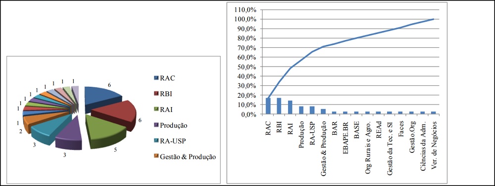 Estes três periódicos concentram aproximadamente a metade do total de artigos encontrados (48,6%), e, se considerados os dois seguintes (RA-USP e Gestão e Produção), representam 66%, ou seja, dois terços do total de artigos encontrados são publicados em apenas 5 periódicos.