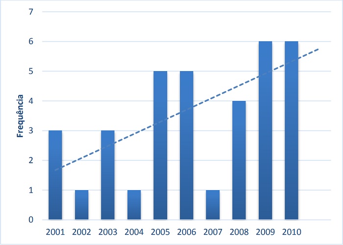 Observa-se que o maior volume anual de publicações sobre o tema ocorreu em 2009 e 2010, com seis artigos cada, e que os últimos três anos da década concentram aproximadamente 46% de todos os artigos encontrados (16 de 35 artigos). Também se observa na década analisada uma tendência de crescimento das publicações, embora haja uma oscilação significativa em alguns períodos.