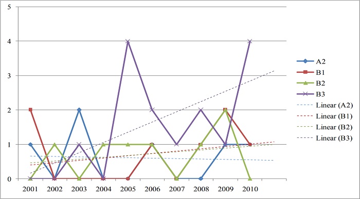 Este volume de publicações tem apresentado tendência de crescimento no decorrer dos dez anos analisados, e de forma mais significativa no estrato de avaliação B3, que concentra o maior número de artigos, sendo bem menor a tendência nos demais.