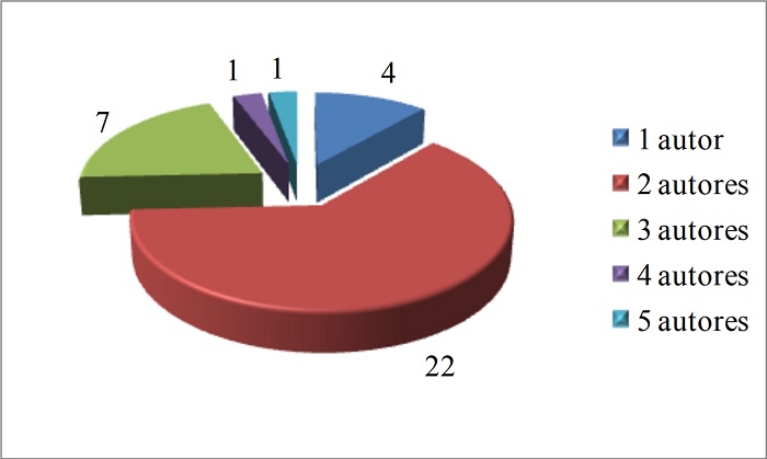 Analisando-se as publicações por autores, a Figura 6 demonstra o número de autores por artigo, onde se observa que a grade maioria (63%) dos artigos é de autoria de dois autores.