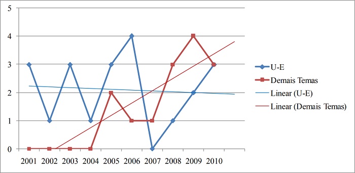 Observando-se a distribuição anual dos artigos sobre universidade-empresa e nos demais temas (Figura 7), é possível perceber uma leve tendência de redução das publicações no tema universidade-empresa, enquanto os demais temas, que são mais específicos e pontuais, somente começaram a ser publicados a partir de 2005 e apresentam uma tendência de crescimento.