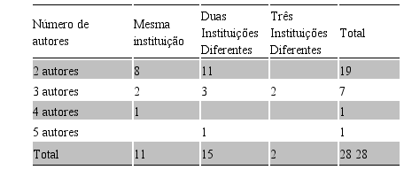 Dos artigos com mais de um autor e que fazem referência à instituição de origem (vinte e oito artigos), é possível analisar a interação entre autores de instituições diferentes. O resultado é apresentado na Tabela 6.
