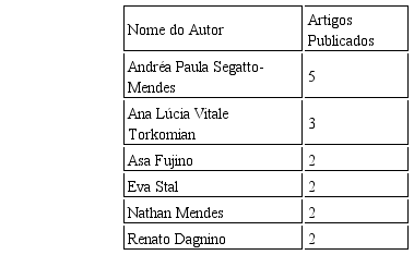 Duas autoras destacam-se com o maior número de publicações sobre o tema, totalizando cinco e três artigos publicados, respectivamente. Os demais autores, que participaram de publicação única sobre o tema no período estão contemplados na Tabela 8.