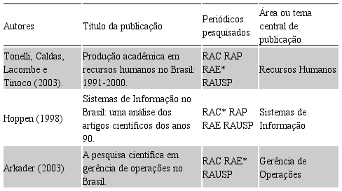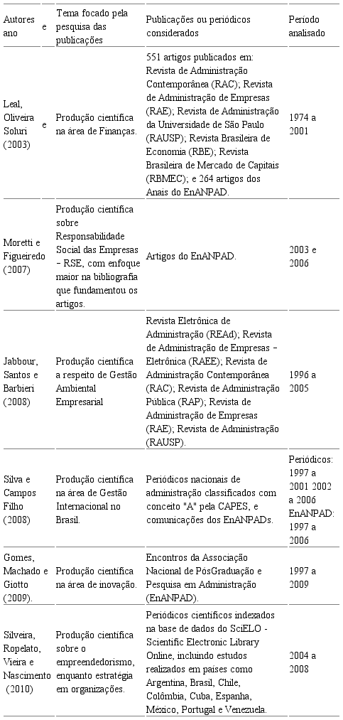 O estudo de Jabbour, Santos e Barbieri (2008) produção científica em temas específicos de cita diversos outros estudos que analisaram a administração (Tabela 2).