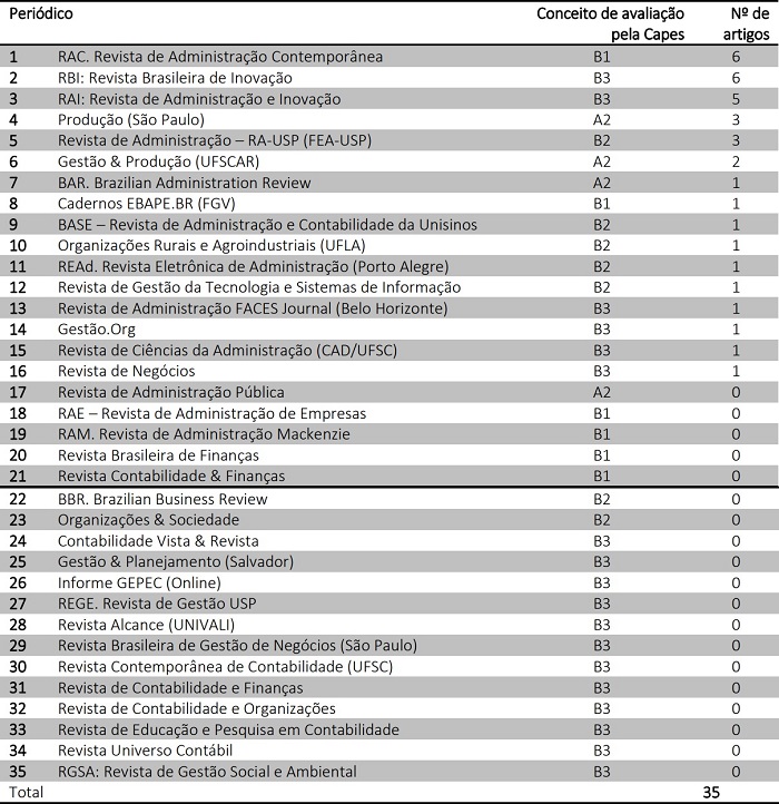 A Tabela 4 demonstra os resultados gerais em quantidade de artigos para todos os 35 periódicos pesquisados.