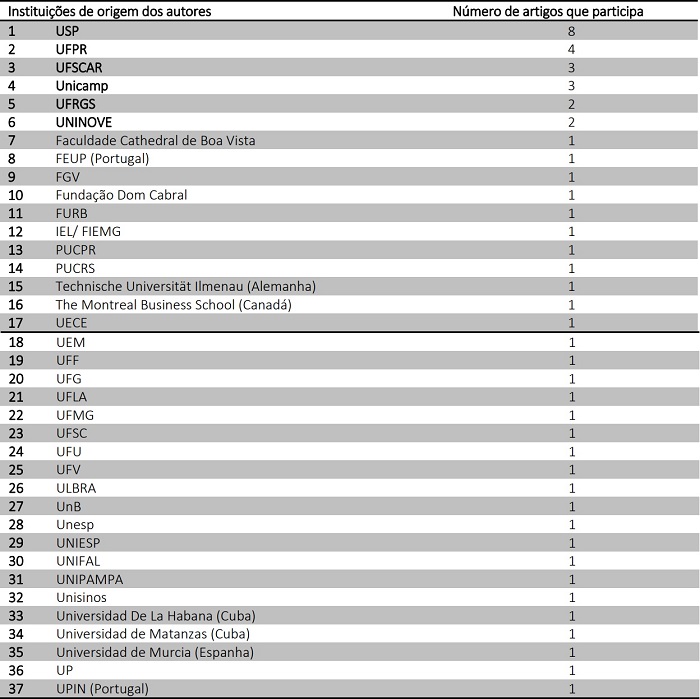 Observa-se que a maior parte das instituições tem participação em apenas um dos artigos analisados, com exceção de seis instituições que participam de dois ou mais. Estas, em conjunto, participam de dois terços (69%) dos artigos, sendo notável que apenas duas destas (que têm autores participando em um maior número de artigos – USP e UFPR) concentram aproximadamente um terço de todos os artigos analisados.