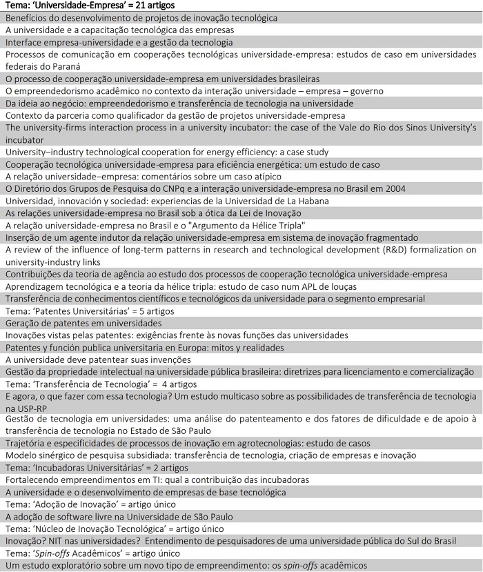 Os demais temas tiveram publicações únicas, e trataram da especificamente de: processo de adoção de inovação por parte de uma universidade; reconhecimento interno sobre o papel dos Núcleos de Inovação Tecnológica (NITs); e as características, motivações e dificuldades dos Spin-offs acadêmicos.