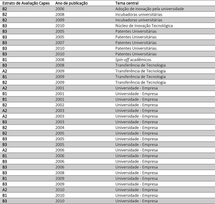 Realizadas as buscas e esgotada a localização de publicações, totalizou-se o número de 35 artigos publicados que atendiam aos critérios estabelecidos para seleção, cujo foco do estudo sobre a inovação fosse a universidade, em primeiro plano. Além destes, outros artigos foram localizados, porém desconsiderados, levando em conta que: