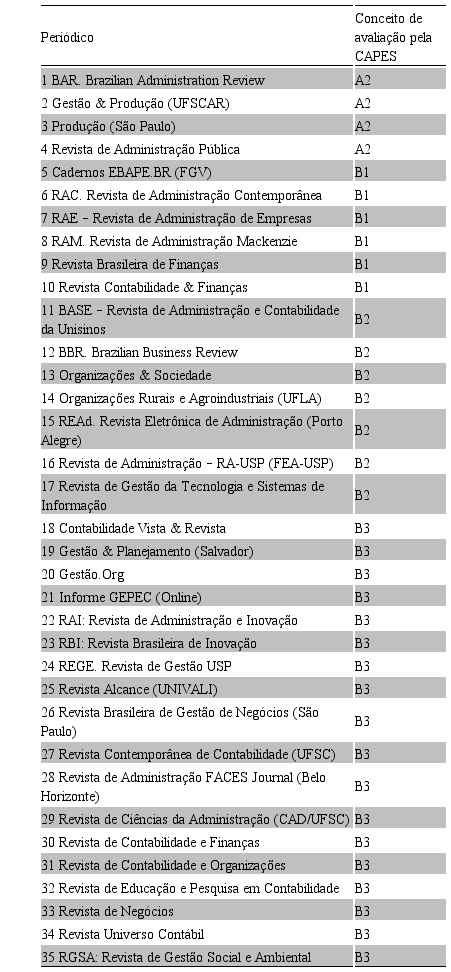 d) avaliados pelo Qualis Periódicos da CAPES, com os níveis de classificação A1, A2, B1, B2, ou B3, na área de avaliação “Administração, Ciências Contábeis e Turismo”, subárea de Administração, conforme resultado obtido no sítio da CAPES referente triênio 2007-2009;