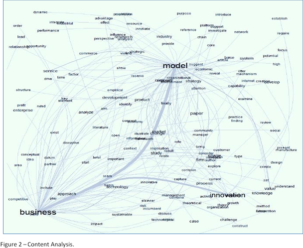 The content analysis made on the abstracts of the 219 articles related to Business Model Innovation was carried out using Iramutech software. The grouping algorithm of terms by joint occurrence resembles the one used in the multidimensional scaling. It becomes clear, as we analyze Figure 2, that Business Model Innovation is the one characterized by its connection to Businesses, with its processes dimensions, competitive advantage, value creation and capture; by the constructs of Innovation, either disruptive or open; and by Models, in products, process and management. It is also apparent, by the terms associated with Models, that its association with concepts come from the field of Strategy, due to the presence of terms such as capacities, industry and platform.