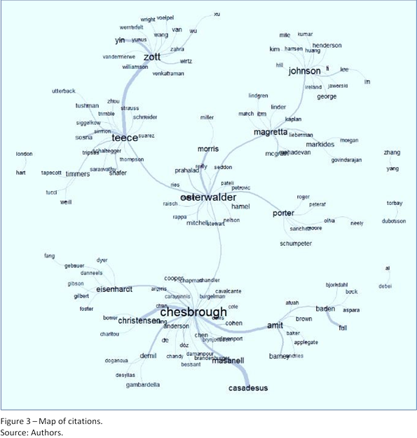 For that analysis, we took into consideration the amount of co-citation cells, thus calculating factors, and the need to identify the main lines of research, according to how authors grouped within those factors. Worthy of note, we could have ruled out, by doing such selection, studies that point out new trends in the field or even early stage ones. However, our objective is to identify and analyze consolidated authors and concepts in the study of Business Model Innovation.