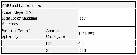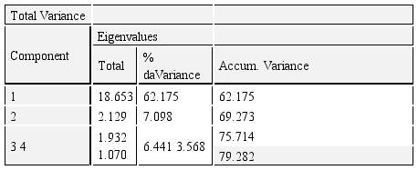 For each extraction, using both principal components and Varimax rotation, the analysis of the results followed the order presented above, and for each eliminated item a new extraction was executed. Results showed on Table 1 indicate the sample adequacy for factor analysis (KMO>0.5).