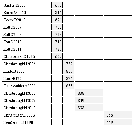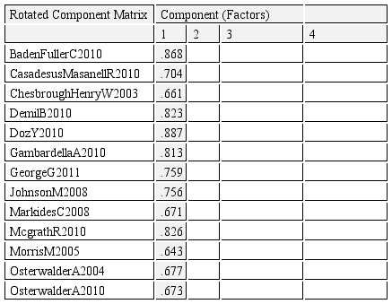 In this section, we present the results of the exploratory factor analysis for the selected articles, how we described each of those authors groups factors and lines of research involved in each one of the factors. The factor analysis procedures in the bibliometric study, using cocitation, aim at identifying the fields of knowledge through the affinity of citations and was also used in the work of Mazieri and Soares (2015). In that paper, the objective was to evaluate the group factors of authors in the Big Data field. Mazieri and Soares not only assessed the group factors by affinity and citations, but also proposed a discussion based in the Resource-Based View to theorize and conceptualize Big Data. We understand a similar approach could be used to analyze the Business Models theme, aim of this investigation.