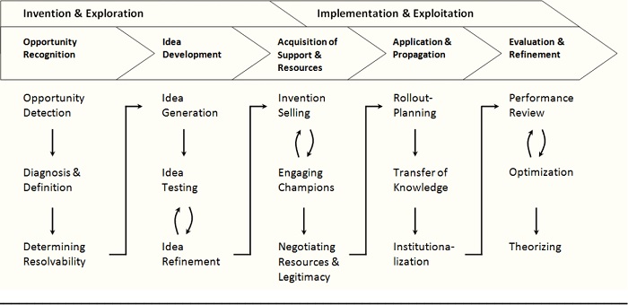 Accommodating these important differences, I merge elements of models of both innovation and entrepreneurship to develop a new type of process model explaining the invention and implementation of organizational innovation (see figure 1). In this model I roughly distinguish two phases that I borrow from numerous innovation process models, i.e., the invention or exploration phase and the implementation or exploitation phase. Underlying these two smoothly transitioning phases are five successive stages (themselves made up of a number of core activities) identified by various process models of entrepreneurship: Opportunity recognition and idea development are main stages of the invention and exploration phase; application and propagation of the invention constitute together with its evaluation and refinement, on the other hand, the implementation and exploitation phase. The acquisition of managerial support and organizational resources marks the transition between these two phases. This stage acts as an important selection mechanism on the stream of organizational inventions, linking mechanisms of experimentation and variation (the focus of the first and second stages) to those of retention and reproduction (the focus of stages four and five).