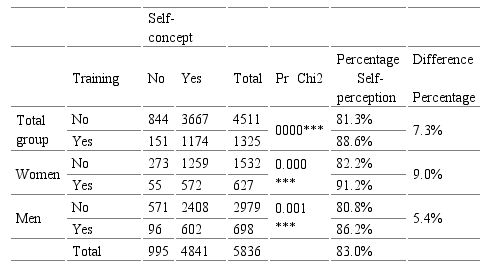 The percentage difference analysis of innovative self-concept among the training participants (differentiating the total group, women and men) evidence that the difference is greater in the group of female micro-entrepreneurs (9.0%). Therefore, it is possible to argue that participation in training could have a greater effect on the self-perception of the female gender.