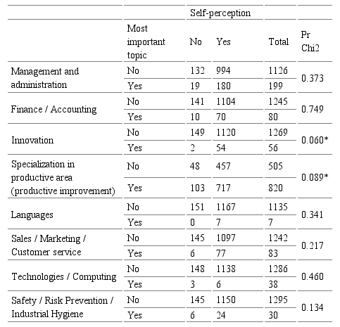 The results of self-perception differences by training topics that are declared as being more relevant, presented in Table 4, shows that for most topics no differences are recognized. Only the micro-entrepreneurs that declare the participation of training in innovation and productive specialization as being most relevant demonstrate a greater proportion of innovative self-perception. The Chi-squared test rejected the hypothesis of equality of proportions with other training subjects (90% confidence).