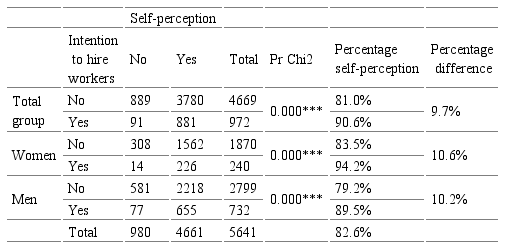 H3: Innovative self-perception is associated with greater intention to hire workers in micro-enterprises.