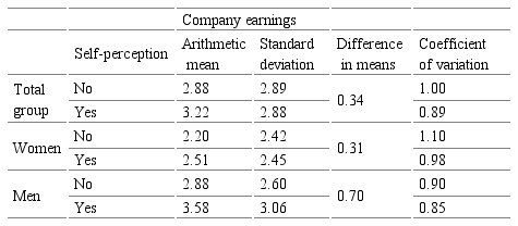 The analysis of percentage differences regarding innovative self-concept among entrepreneurs with and without intent to hire shows a greater difference in women. Therefore, it is estimated that women with innovative self-perception could have more intention to hire compared to men. In relation to differences in the level of company earnings with and without innovative self-concept, Table 6 illustrates a greater arithmetic mean in the segment of profits in micro-entrepreneurs that are considered as innovative. Moreover, the difference of the mean in groups with innovative self-concept is greater in men (0.70) compared to women (0.31).