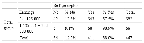 Likewise, a profit dispersion analysis was carried out through the calculation of coefficient of variation in micro-entrepreneurs with and without innovative self-concept. When comparing the total group and the group of women and men, there is a greater dispersion of earnings in the group of women without innovative self-concept (Coefficient of variation=0.85), as well as a greater difference in coefficient of variation among women with and without an innovative self-concept (0.98-1.10=-0.12). On the other hand, men who perceive themselves as innovators demonstrate less profit dispersion (Coefficient of variation=0.85). Moreover, a smaller difference in coefficient of variation was presented between men with and without an innovative self-concept (0.85 – 0.90= -0.05). Additionally, the frequency analysis of profit levels in micro-enterprises shows a higher percentage of people with innovative self-concept in the higher benefits section in the total sample and in the group of male and female micro-entrepreneurs. Table 7 illustrates these percentages considering 467 validated answers of micro-entrepreneurs. The results are consistent with those obtained in Table 6.