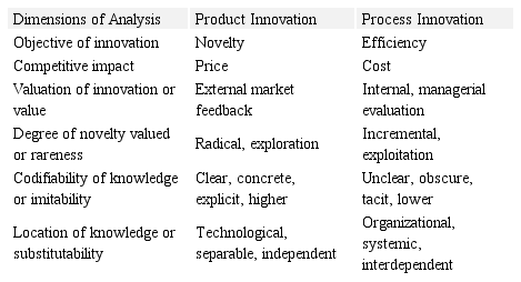 Table 1 shows that product innovation tends to be concentrated more on the technological aspects, with teams of specialists working on innovation. This partially limits substitution by competitors with different skills. On the other hand, process innovation tends to be more systemic and interdependent, as it requires collaboration between different units, and a change in the process of a company activity tends to affect related activities and areas.
