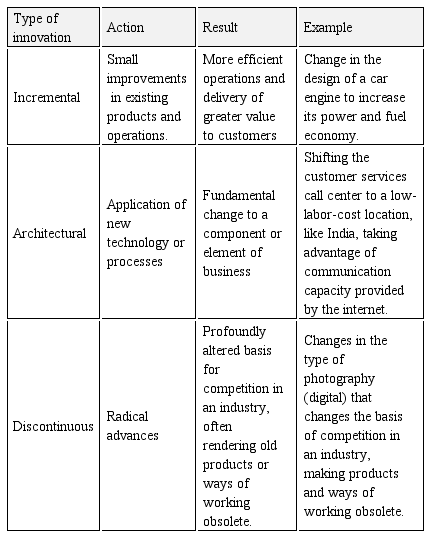 The name and characteristics of the three categories used by O'Reilly and Tushman (2004) to map the various examples of innovation that they studied are shown above the arrow in Figure 1. Below the arrow are the three general approaches to processing change: process improvement, process redesign and process re-engineering.