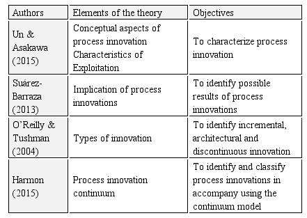 Despite the little importance given to process innovations by academics and companies, Piening and Salge (2015) claim that they are important sources of competitiveness, and they encourage research on their implications, antecedent and contingency aspects. Keupp, Palmié and Gassmann (2012) corroborate this and point out that research on this topic helps to improve understanding of how companies introduce innovations through organizational and managerial activities.