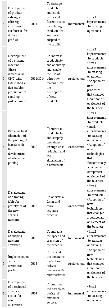 According to AB, irrespective of innovations having become popularized in discussions on the success of the business, his company has always sought to solve the problems and face the challenges that arose, whether internal or external, as were most in his opinion. One of his main concerns has always been to improve the means of producing surfboards, with the least possible effort, the most quickly and in the highest possible number to meet the growing demand from the market. This intention can especially be seen in Innovations 1, 2, 5, 6, 7 and 8 (Table 4).