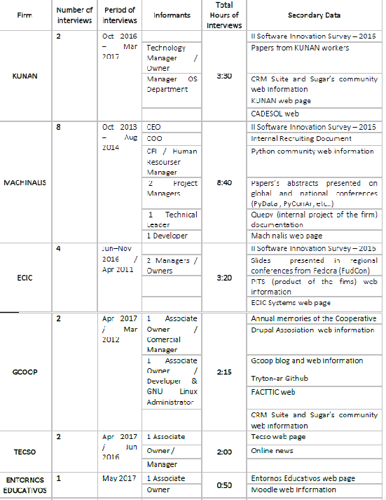 To identify some specificities of innovation in FLOSS firms, we applied a qualitative methodology based on case studies through a series of interviews (Denzin & Lincoln, 2005; Eisenhardt, 1989; Yin, 2009). During 2012-2017 we performed 7 in-depth case studies in FLOSS firms from Argentina, which are diverse regarding structural characteristics as size, location and production specialization.