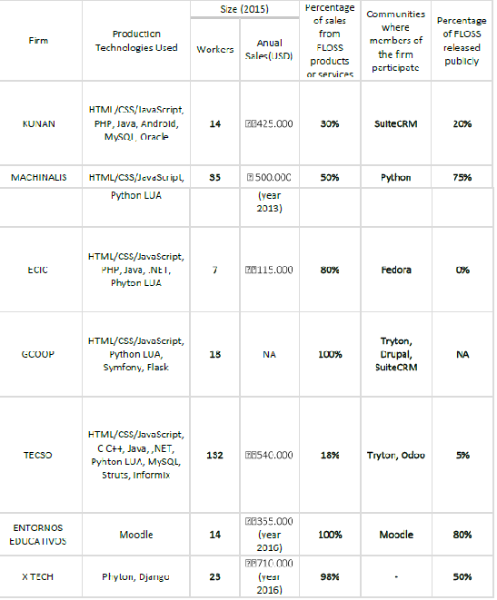 Moreover, we combined diverse data sources: web information about communities (Python, Tryton, CRM Suite and CRM Sugar, Drupal), community conferences where the firms participated (PyCon, PyAr, FudCon, etc.), and the web page information of the firms. For some cases, we have data from an innovation survey done in the software sector from Argentina during 2016. This survey provides information about production specialization, demand and market orientation, economic and innovation performance, innovative activities, quality standards certification, and use and production of FLOSS.