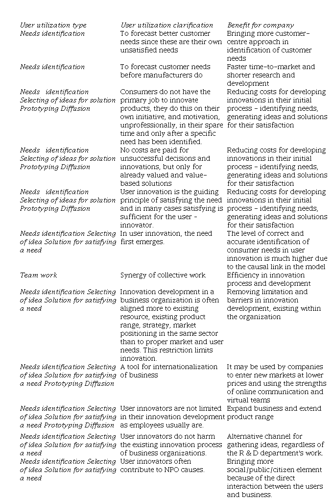 As such, users are an increasingly important actor especially in innovation networks where users can reveal the most of their potential to innovation development and innovation progress. Yordanova (2018a) reports an analysis of the benefits of utilizing users in innovation development, presented in table 1.