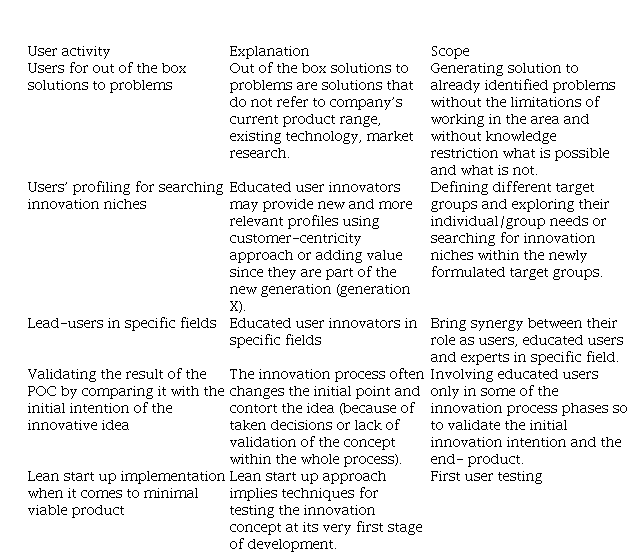 As a result from the conducted research are clarified 26 activities in which educated user innovators may take part as part of innovation development in business organizations. The research also clustered them into three groups: not applicable, possible and potential according to 15 innovation managers who had already utilized users in their innovation projects.
