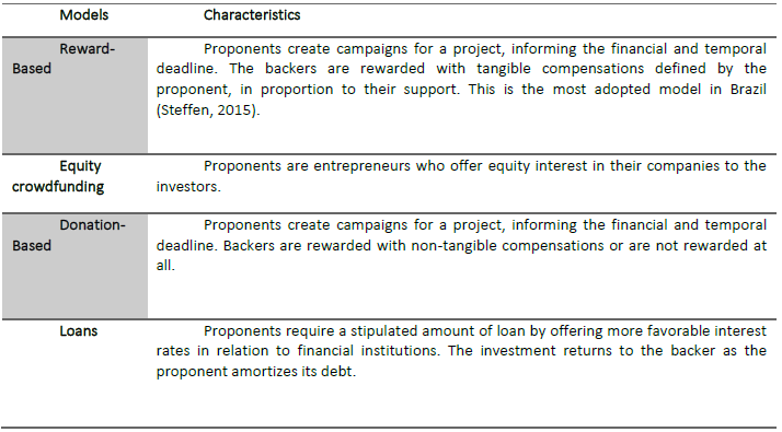 There are different crowdfunding models in effect, being tested and improved. Although there are several propositions of subcategories, the categorization shown in the table below is based on the following studies: Mollick, 2013; Belleflamme & Lambert, 2014 and Monteiro, 2014.