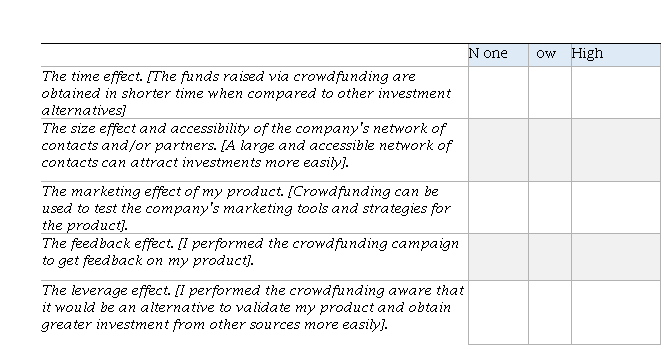 As for the other effects that were relevant to the decision, time, size and accessibility of the company’s network of contacts and/or partners were known before the beginning of the campaign and therefore, the company expected to get enough return from them. On the other hand, despite previously knowing the feedback, leverage and marketing effects, the company expected to get a lower return from these types. The interview revealed that the latter even generated negative results after being compared and associated with “kitties” – she says she heard many derogatory jokes because of this association and thus she believes that there is prejudice against the use of crowdfunding by startups in Brazil, as if requesting funds to others demonstrate a business weakness or inability to raise funds via traditional means.