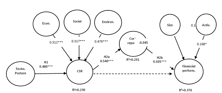 Finally, size (measured as the logarithm of the company’s number of employees) and the type of activity (dummy variable) were included in the model as control variables. The results show that both variables have a significant influence for financial performance (β= 0.152, p< 0.001; β= 0.168, p< 0.001). However, the inclusion of company size and the type of activity into the model does not modify the significance of the relationships between technological leadership, CSR, corporate reputation or financial performance for this study.