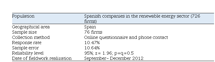 Secondary data from these companies were obtained from two Spanish specialized directories (the IDAE and the Directorio Especializado en Empresas de Energías Renovables from the Spanish Industry Ministry). There are two main reasons to use this set of related activities in this study: (1) Renewable energy activities are very sensitive to CSR activities since their products, processes and services have high impacts in economic, social and environmental terms; (2) their great importance for the Spanish Economy, where the contribution to GDP was around 1% in 2017. This set of industries reveals a panorama of the renewable energy sector in Spain, where CSR implementation is significant from both business and governmental viewpoints. Moreover, this is an emerging sector and R&D investments and innovative strategies based on CSR are expected to be an important aspect for firms, as survival and competitive advantages are closely dependent upon it.