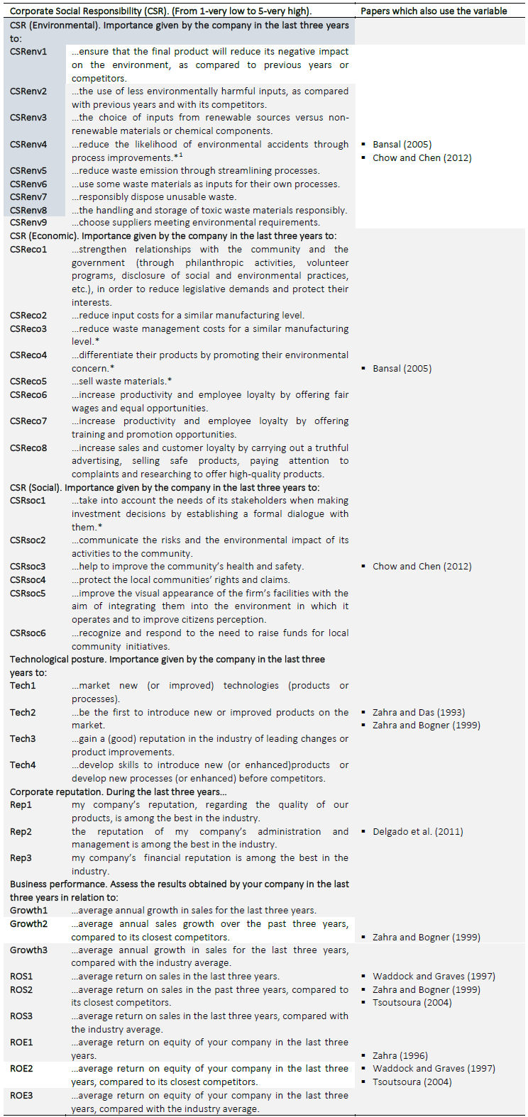 For the environmental dimension of CSR, nine items were taken and adapted from the measures elaborated by Bansal (2005) and Chow and Chen (2012). This scale included aspects relating to efforts for reducing negative impacts from the company’s activities, selection of responsible suppliers, or the use of environmental friendly inputs.
