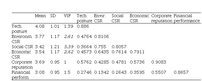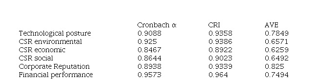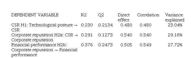 In this regard, technological posture explains 23.04% of the CSR’s variance. CSR in turn explains 29.16% of corporate reputation’s variance and finally, corporate reputation explains 27.72% of the variance in financial performance.