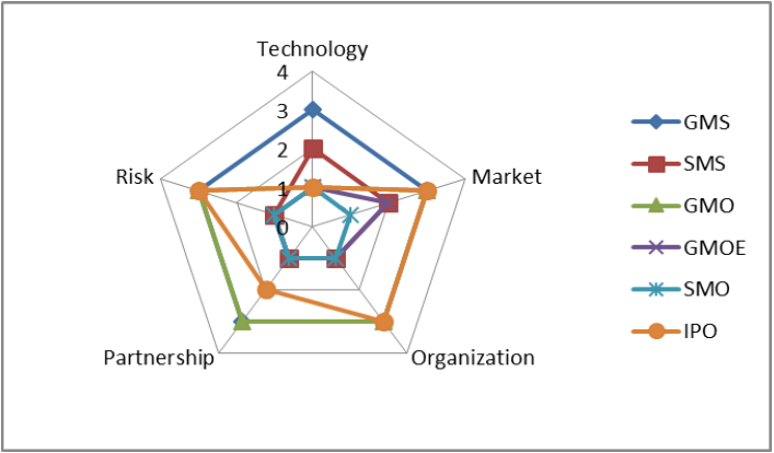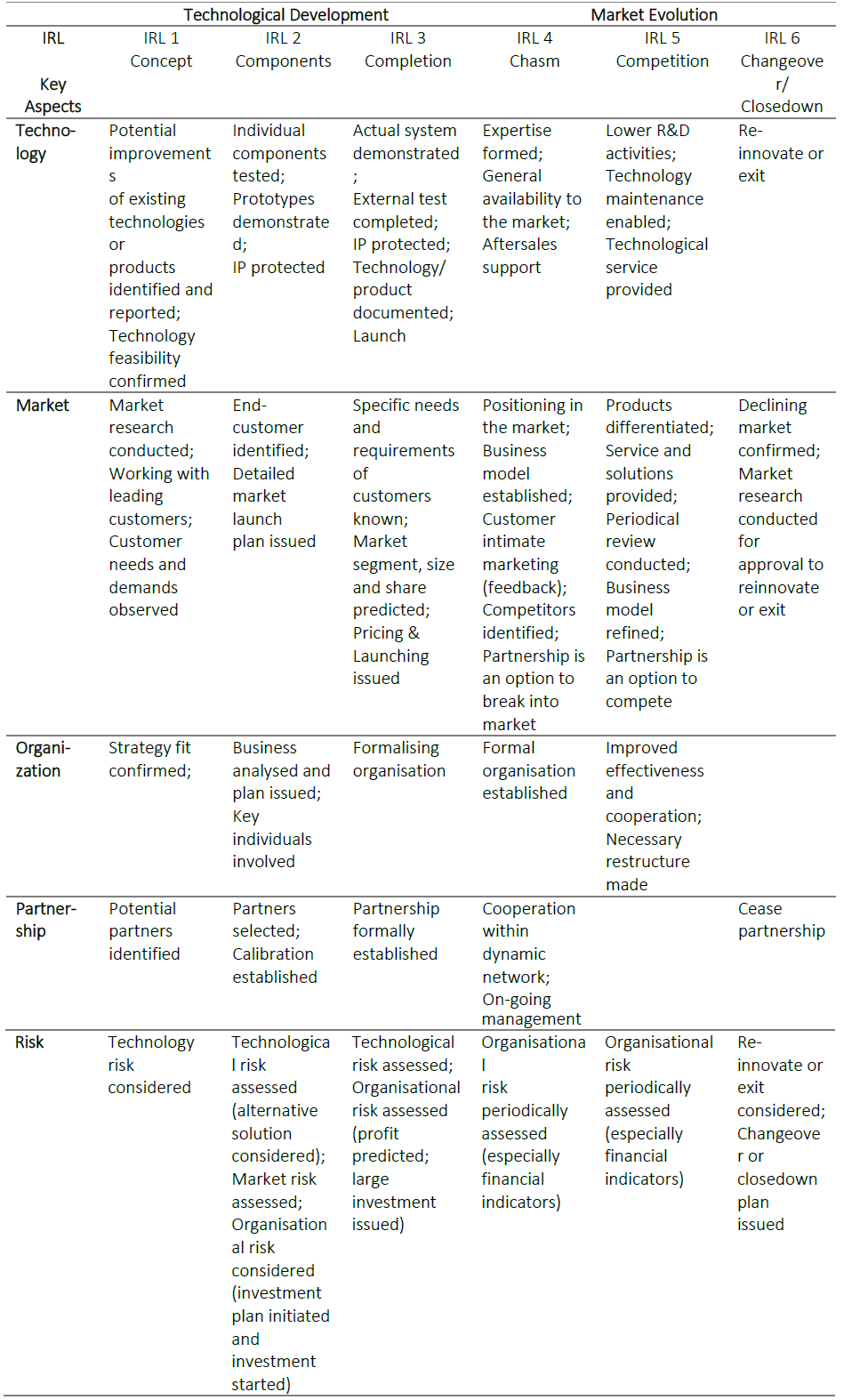 The concept of IRL is based on six “C” model which represents a comprehensive lifecycle phase of innovation, i.e. Concept, Component, Completion, Chasm, Competition and Changeover/ closedown. Each phase is projected upon five aspects including technology, market, organization, partnership and risk (Lan et al., 2010). Further development of the concept of IRL has been also studied by Lee, et al. (2011), which acccommodates innovation theories such as product life cycle, system readiness levels, the market adoption model, and technology readiness level. The overall framework for assessing IRL is depicted in Table 2.