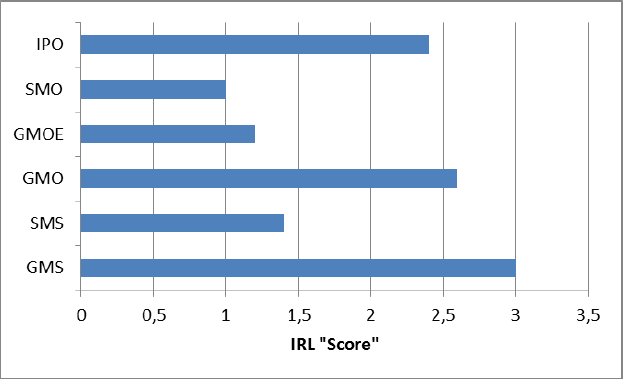 The result of the assessment is depicted in Fig. 4. The assessment result shows that the highest TRL score of surfactants is GMS (Glycerol Mono Stearate) which has reached TRL level 7. This is followed by SMS (TRL 4) and then by SMO (TRL 3) and GMOE (TRL3). If this result displayed using IRL perspective, GMS has entered IRL 3, SMS has entered IRL 2, while the others are still in IRL 1.