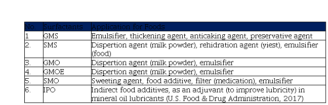 Surfactants can be applied for food in form of emulsion, such as oil in water (O/W) emulsion, water in oil (W/O) emulsion and water in oil in water (W/O/W) emulsion (Sharma, 2014).