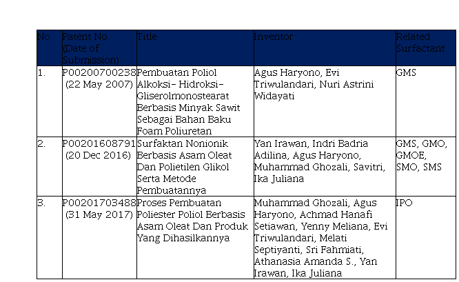 Aside from researches, the surfactant technology developments has also been registered in form of patents. Table 3 shown the patents achievement related to surfactants by inventor of RCC LIPI.