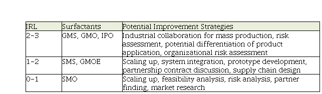 These recommended results can be used to formulate strategy and policy for promoting the surfactant research toward commercialization. With limited number of resources such as personnel, facilities and fund, surfactants can be prioritized based on the result from this study. Surfactants with mid to high level of assessment result will be offered to industry for partnership and collaboration, by utilizing the available infrastructure. While low to mid level ones should be encouraged to conducting further research and scaling up by applying relevant funding. Table 4 detailed this potential strategies for improvement further.
