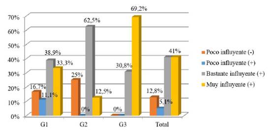 Mediante el cuestionario que empleamos en este estudio pudimos conocer la percepción de los estudiantes sobre el tipo de influencia (positiva, negativa o nula) y la intensidad de la influencia (poca, bastante o mucha) que el trabajo colaborativo ejerció en sus creencias de autoeficacia durante la asignatura que nos ocupa. Tal y como refleja la Figura 3, la gran mayoría de los estudiantes (82% del total, 72,2% en G1, 75% en G2, 100% en G3) consideran que el trabajo colaborativo ha repercutido de forma positiva y bastante o mucho en sus creencias de autoeficacia.